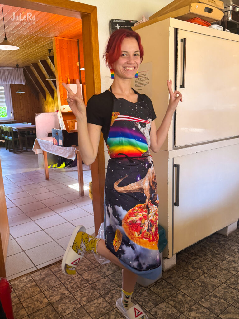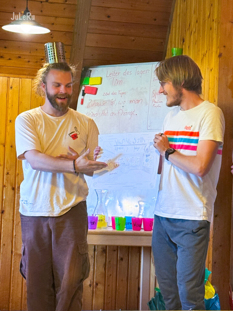 Damit man auch von außen direkt weiß, wer in welchem Zimmer wohnt, wurden nachmittags Türschilder gebastelt und dann von den Leitern nach Kreativität, Zimmer-Namen, Materialien und Präsentation bewertet. Das Zimmer mit den meisten Punkten war „Die Krosse Krabbe“ und zur Belohnung durften die drei Mädels dann die Türschilder der Leiter bewerten! Anschließend wurden alle Schilder aufgehängt und jetzt fühlt es sich wirklich an, als wären wir angekommen.