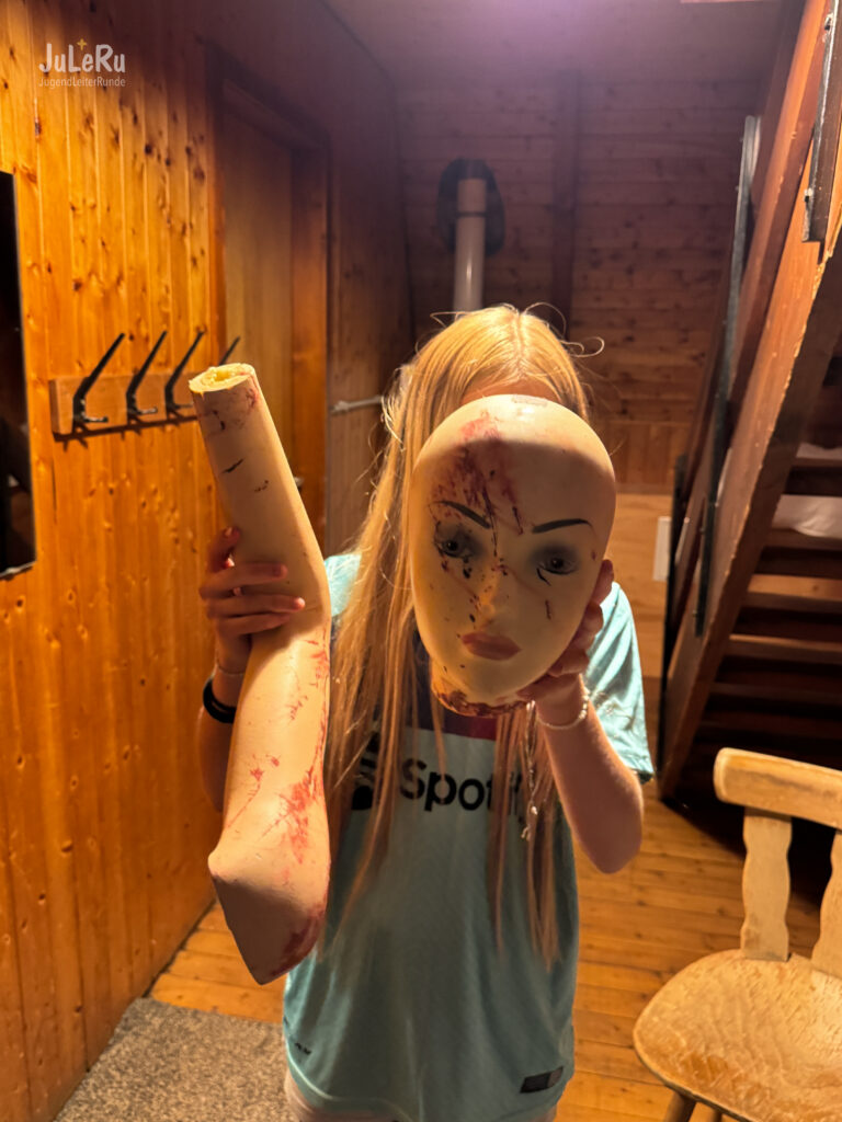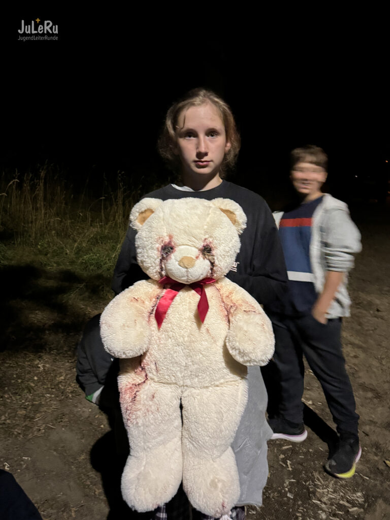 Für die Älteren hingegen wurde es dann gruselig! Nach einer schaurigen Geschichte am Lagerfeuer gab es eine Nachtwanderung durch den Wald, wo ein verrückter Holzfäller, gruselige Kuscheltiere, Puppenteile und ein seltsames Ticken auf die Kinder gewartet haben. Und dann ist auch noch Matthäus mittendrin verschwunden! Es wurde sich viel gegruselt, erschreckt und der ein oder andere hat auch geschrien, also ein voller Erfolg! 🙂 Achtung: Die nächsten Bilder sind gruselig, aber allen beteiligten geht es gut!